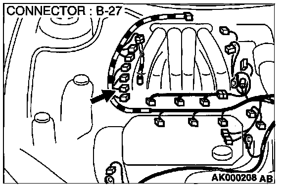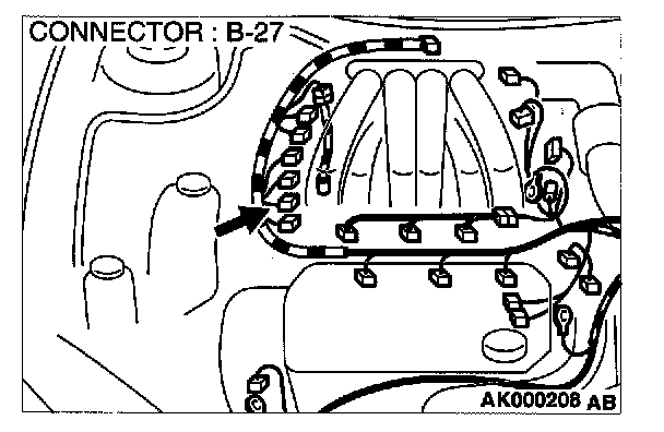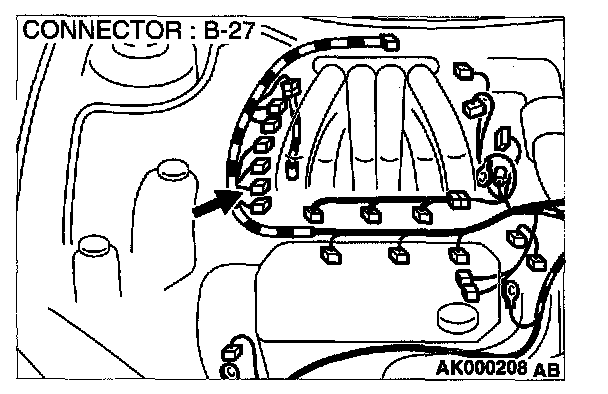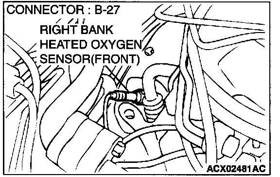 1. Disconnect right bank heated oxygen sensor (front) connector B-27 and connect test harness special tool, MD998464, to the connector on the right bank heated oxygen (front) sensor side.