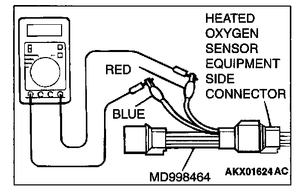 2. Measure the resistance between heated oxygen sensor connector terminal 1 (red clip) and terminal 3 (blue clip).