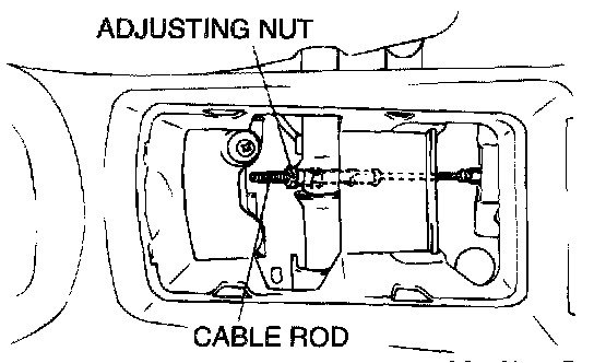 2. If the parking brake lever stroke is not the standard value, adjust as described below. Remove the floor console cup tray or arm rest assembly, loosen the adjusting nut as far as the end of the cable rod to release the cable, and then adjust by the following procedure: