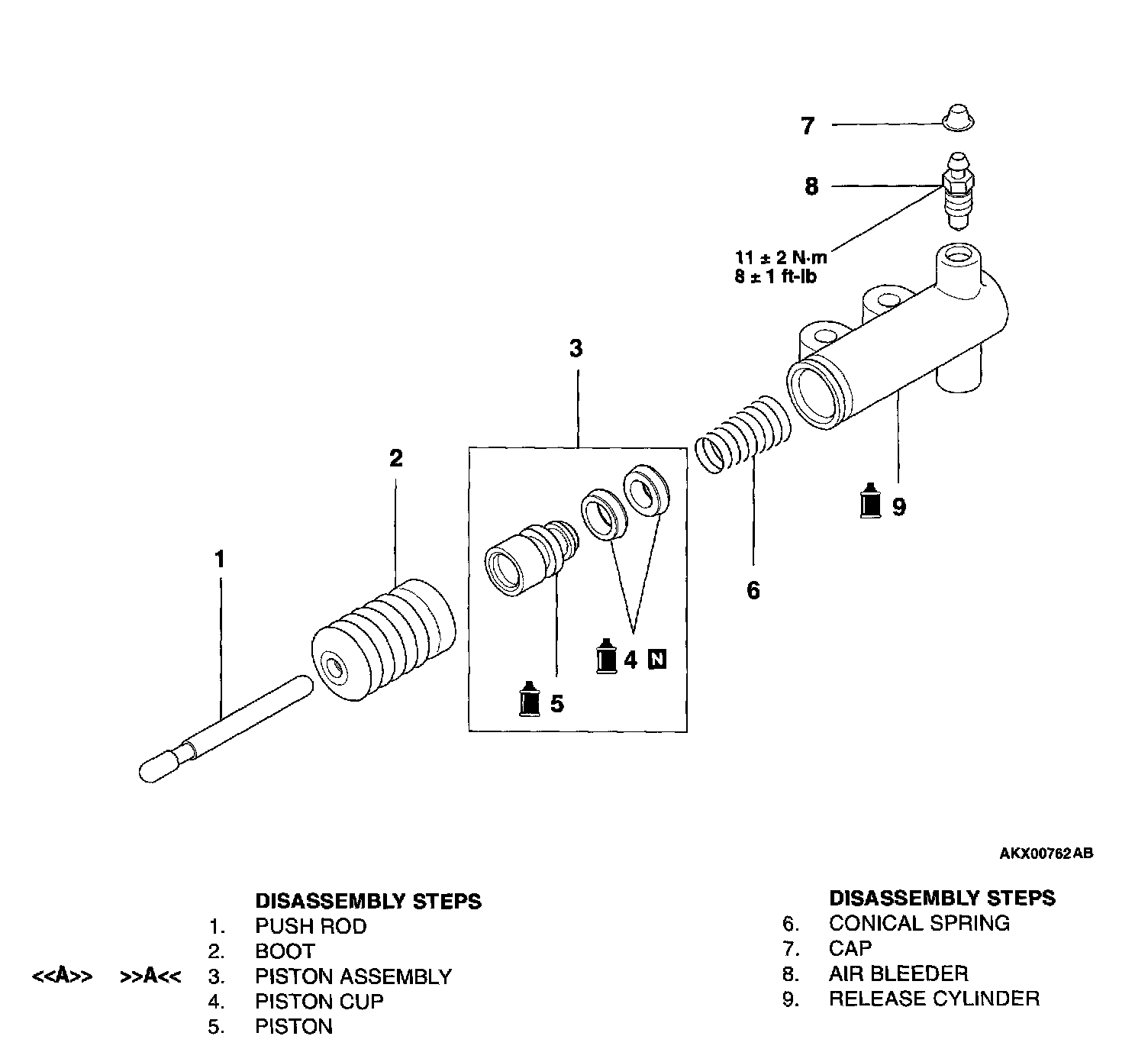 1. Apply brake fluid SAE J1703 (DOT3) to the piston cup and inner surface of the release cylinder.