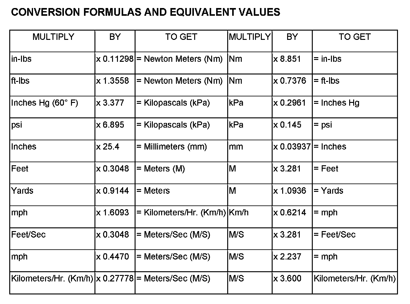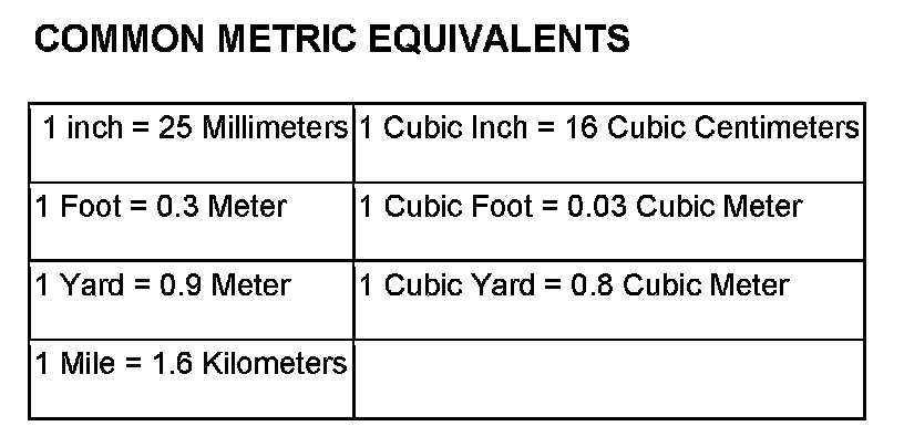 The following chart will assist in converting metric units to equivalent English and SAE units, or vise versa.
