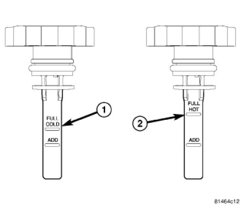 Use the HOT side of the dipstick (2) to measure when the vehicle has been running and the fluid is hot. When the fluid is hot, the fluid level is allowed to read up to the FULL HOT line. Only add fluid to the system when the vehicle is cold.