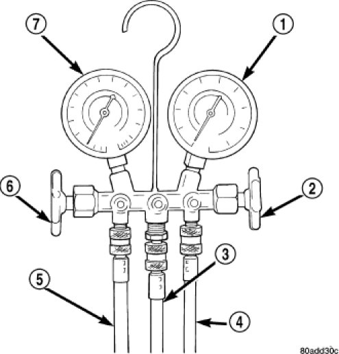 A manifold gauge set (1) may be needed with some recovery/recycling/charging equipment. The manifold gauge set should have manual shut-off valves (2 and 6), or automatic back-flow valves located at the service port connector end of the manifold gauge set hoses (4 and 5). This will prevent refrigerant from being released into the atmosphere.