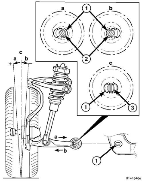 - To achieve more positive camber, refer to (a) in the figure. Move the control arm in the desired direction, then insert the adjustment bolt (2) with a washer installed through the bat wing hole in the engine cradle (1) and round hole in the bushing inner metal.