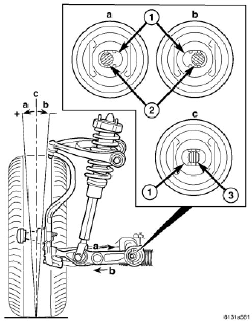 NOTE: The grooves on the adjustment bolts are off-center forcing the bolt to be installed in one of two ways depending on whether more positive or negative camber or caster is necessary. The Bolts must be rotated 180� to achieve either more positive or negative camber or caster. DO NOT force the adjustment bolt.