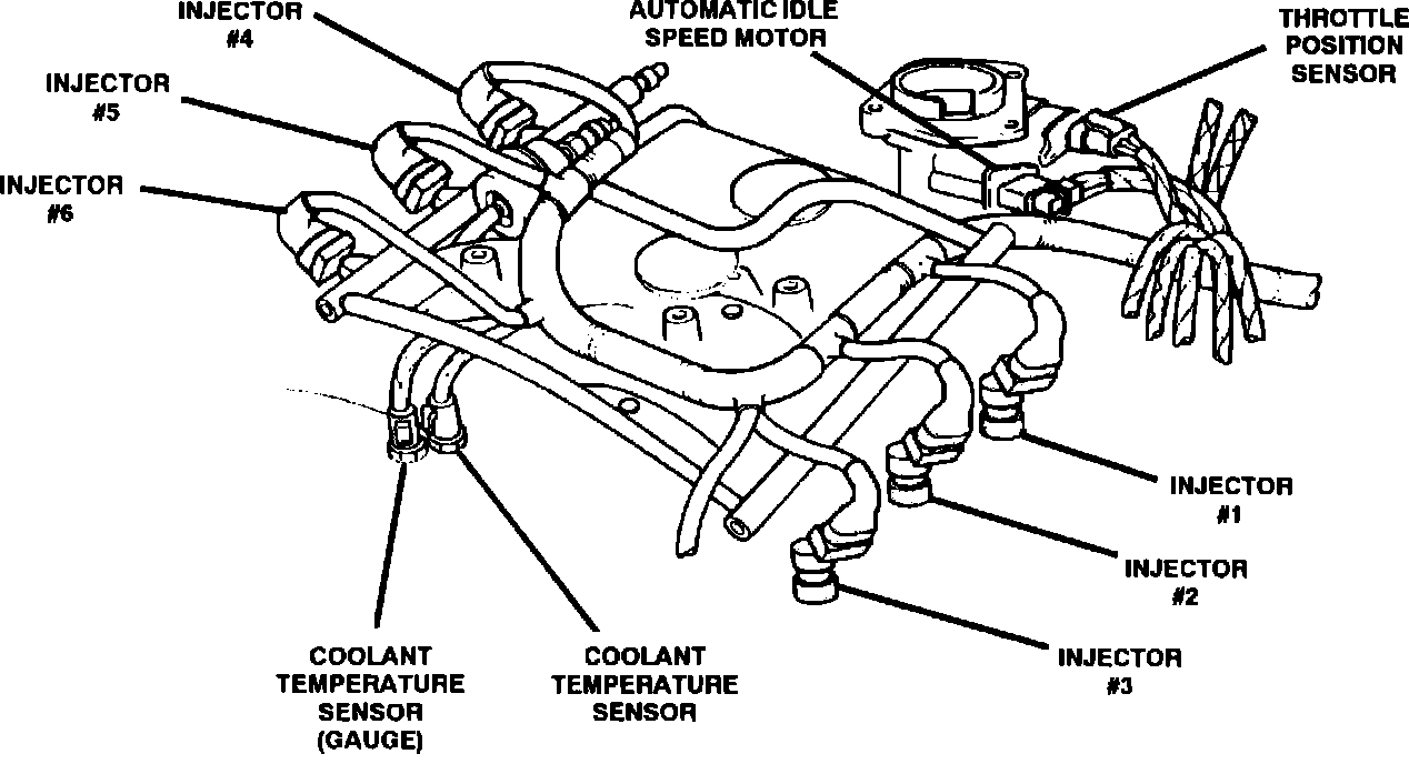 The Coolant Temperature Sensor connector is located on the intake manifold, at the left rear corner behind the throttle body assembly.
