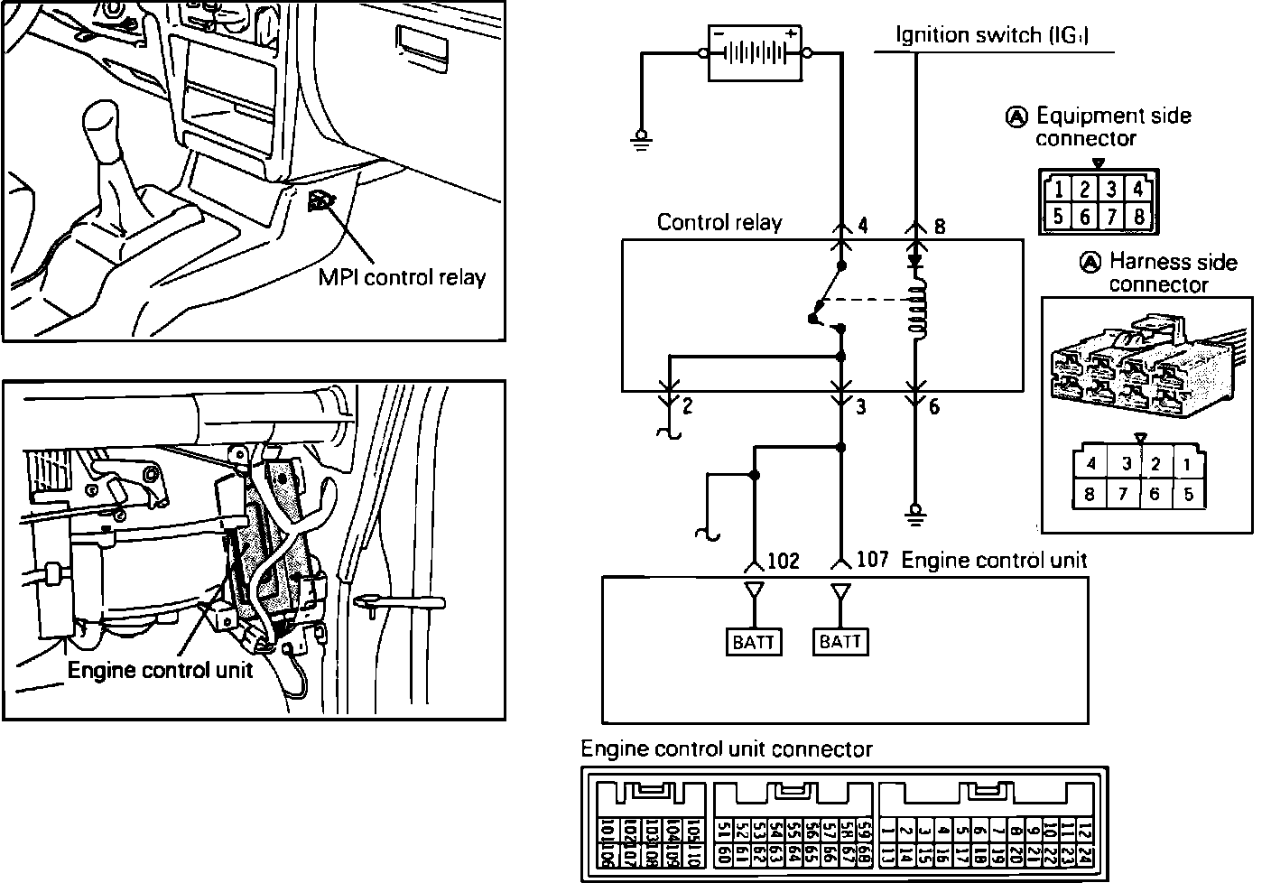 7. Using an ohm meter, check for continuity between the ECU harness terminal 102 and relay harness connector terminal 3.