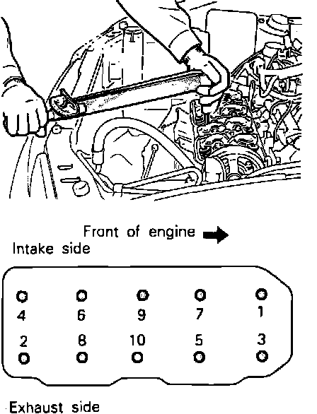 Fig. 29 Cylinder head bolt tightening sequence. 1992 2.4L/4-143.5 engine: