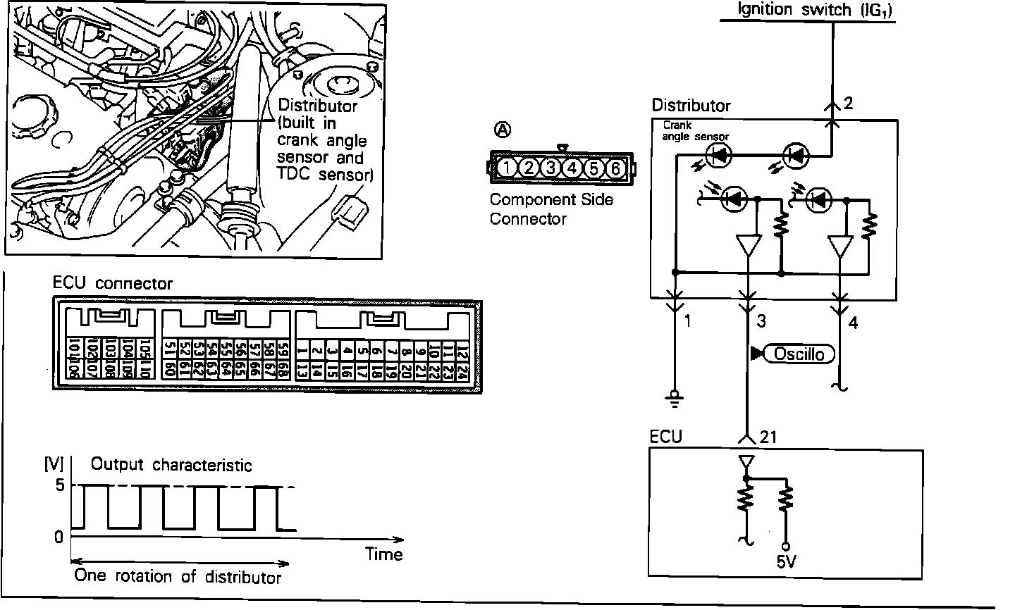 1. Connect test leads from the oscilloscope to the #3 terminal of the sensor connector and run the engine at idle speed.