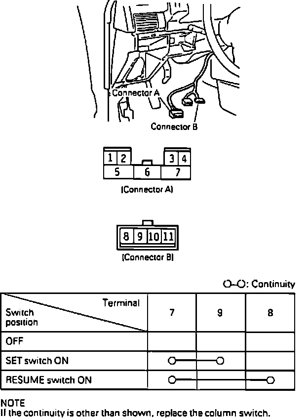 Gain access and disconnect connector to speed control main switch and check for continuity between terminals as shown.