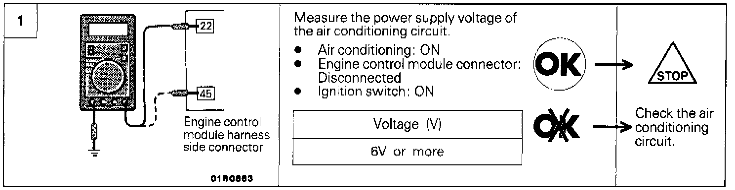 If the air compressor magnet clutch is not activated when the air conditioning switch is turned ON during idling, faulty air conditioning control system is suspected.