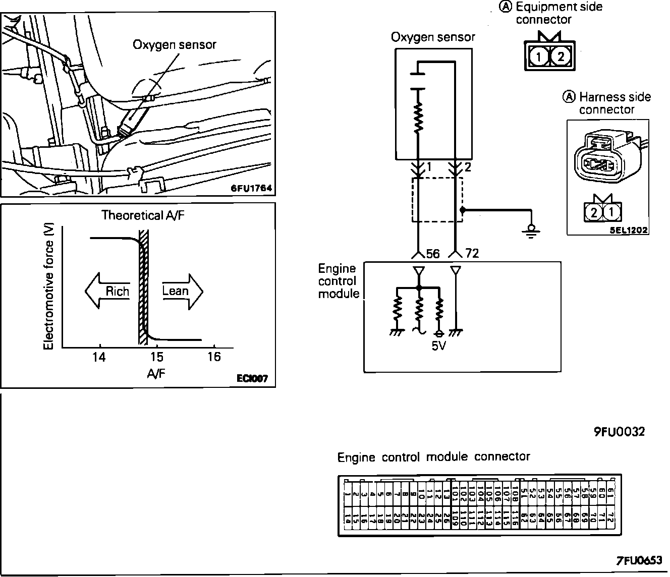 2. Disconnect the oxygen sensor from the wire harness and connect a digital voltmeter (greater than 1 Meg ohm input impedance) between the oxygen sensor output connector and ground.