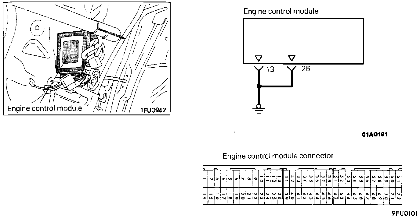 3. Using an ohm meter, check for continuity between ECM harness terminal 26 and ground.