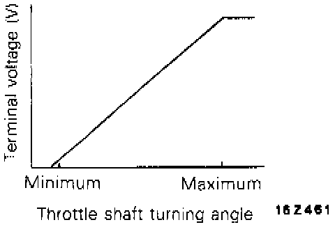 As the throttle valve shaft rotates from the idle position to wide open position, the resistance between the variable resistor terminal of the throttle position sensor and the ground terminal increases. As a result, the voltage at the throttle position sensor variable resistance terminal also increases.