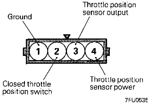 3. Check for continuity across terminals 2 (closed throttle position switch) and 1 (ground) with the throttle valve both fully closed and fully open.