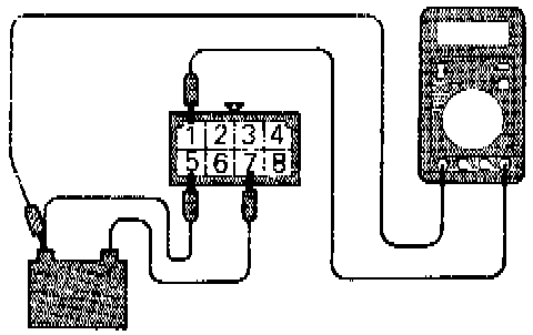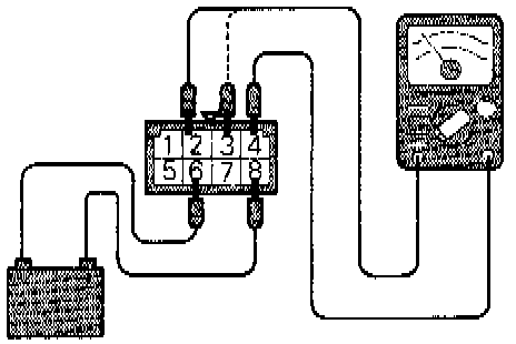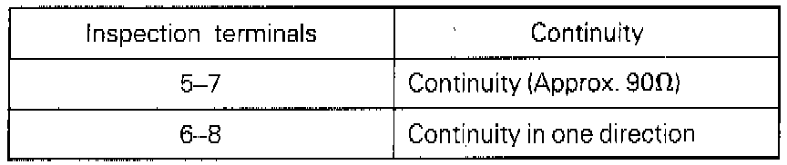 6. Check the continuity between MFI relay terminals (2) - (4) and terminals (3) - (4) while connecting and disconnecting the jumper lead at the battery (-) terminal.