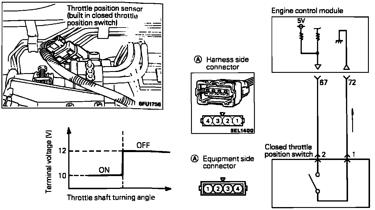 2. Disconnect the harness connector and connect an ohmmeter to the closed throttle position switch connector terminals #1 and #2. Refer to the connector in the image.
