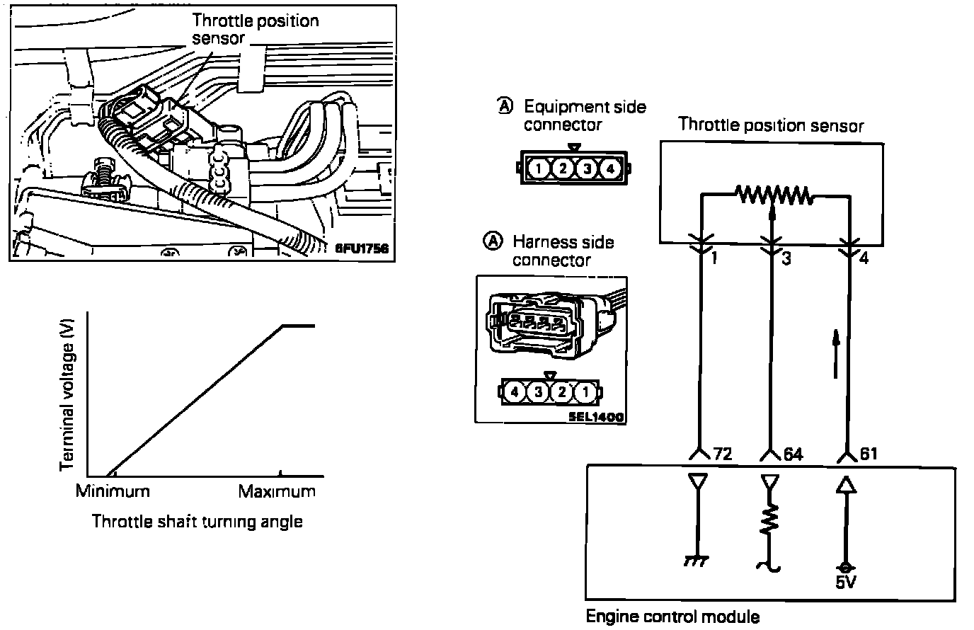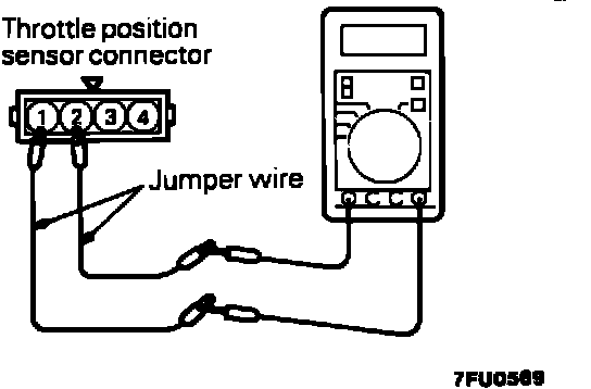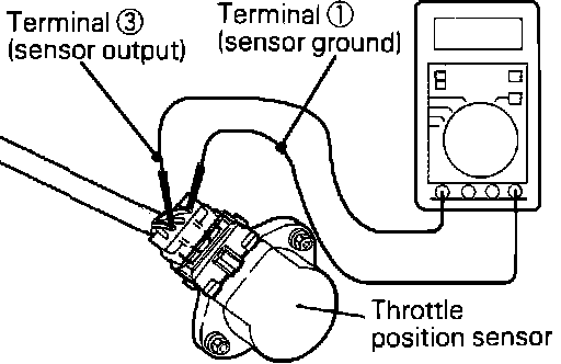 3. Using a high-impedance digital voltmeter, carefully back probe the throttle position connector into terminals #1 (sensor ground) and #3. (sensor output) Refer to the connector in the image.
