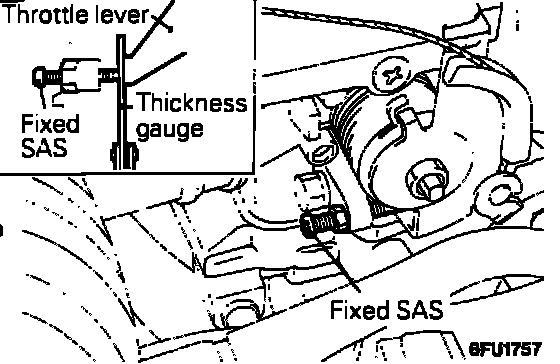 5. Insert a .0256 in. (0.656 mm) feeler gauge between the SAS screw and throttle lever