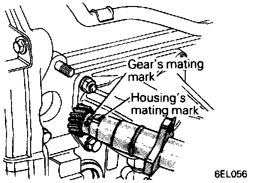 3. Place an alignment mark on distributor body and engine block, indicating position of distributor body in block or cylinder head. Place No. 1 cylinder to TDC of compression stroke. Place another mark on distributor body indicating position of rotor. Do not use a sharp tool to place alignment marks on distributor body and engine block or cylinder head.