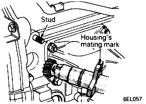 3. Install the distributor to the engine while aligning the fine cut (groove) on the distributor's installation flange with the center of the distributor installation stud.