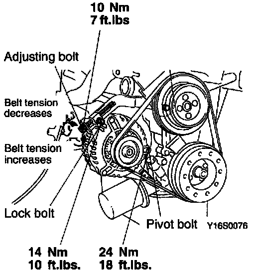 5. After adjusting the belt tension, fully tighten the nut of the pivot bolt and the lock bolt to the specified torque, and then tighten the adjusting bolt to the specified torque.
