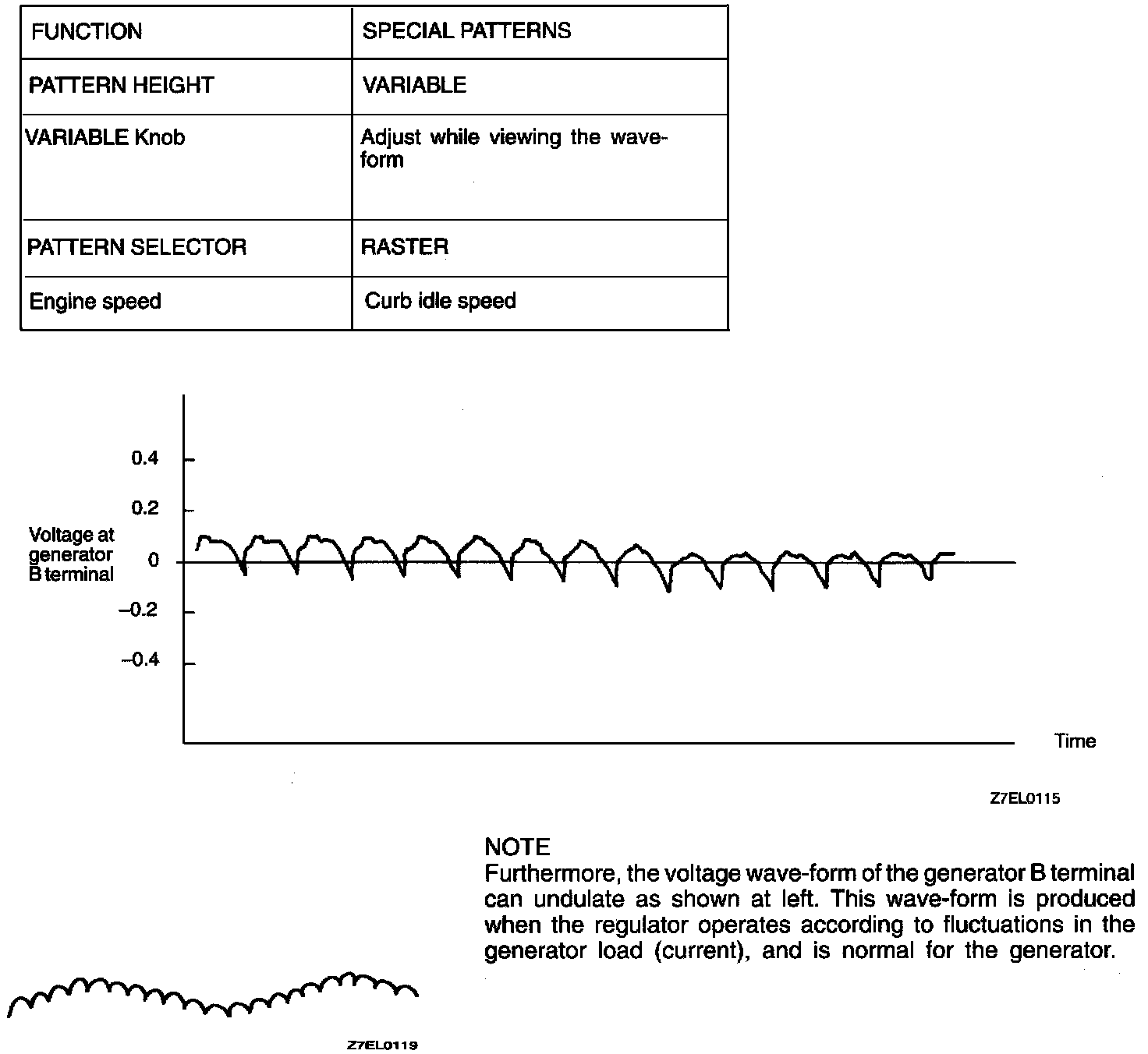 NOTE: Furthermore, the voltage waveform of the generator B terminal can undulate as shown at left. This waveform is produced when the regulator operates according to fluctuations in the generator load (current), and is normal for the generator.