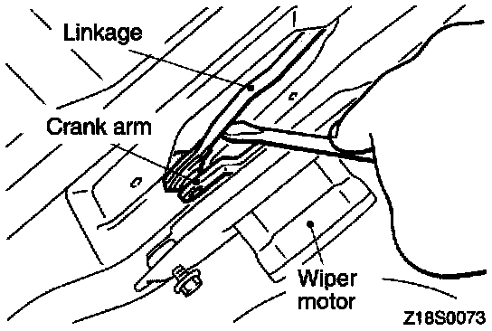 Loosen the wiper motor assembly mounting bolts, and then remove the wiper motor assembly. Disconnect the linkage and the motor assembly, and then remove the linkage.