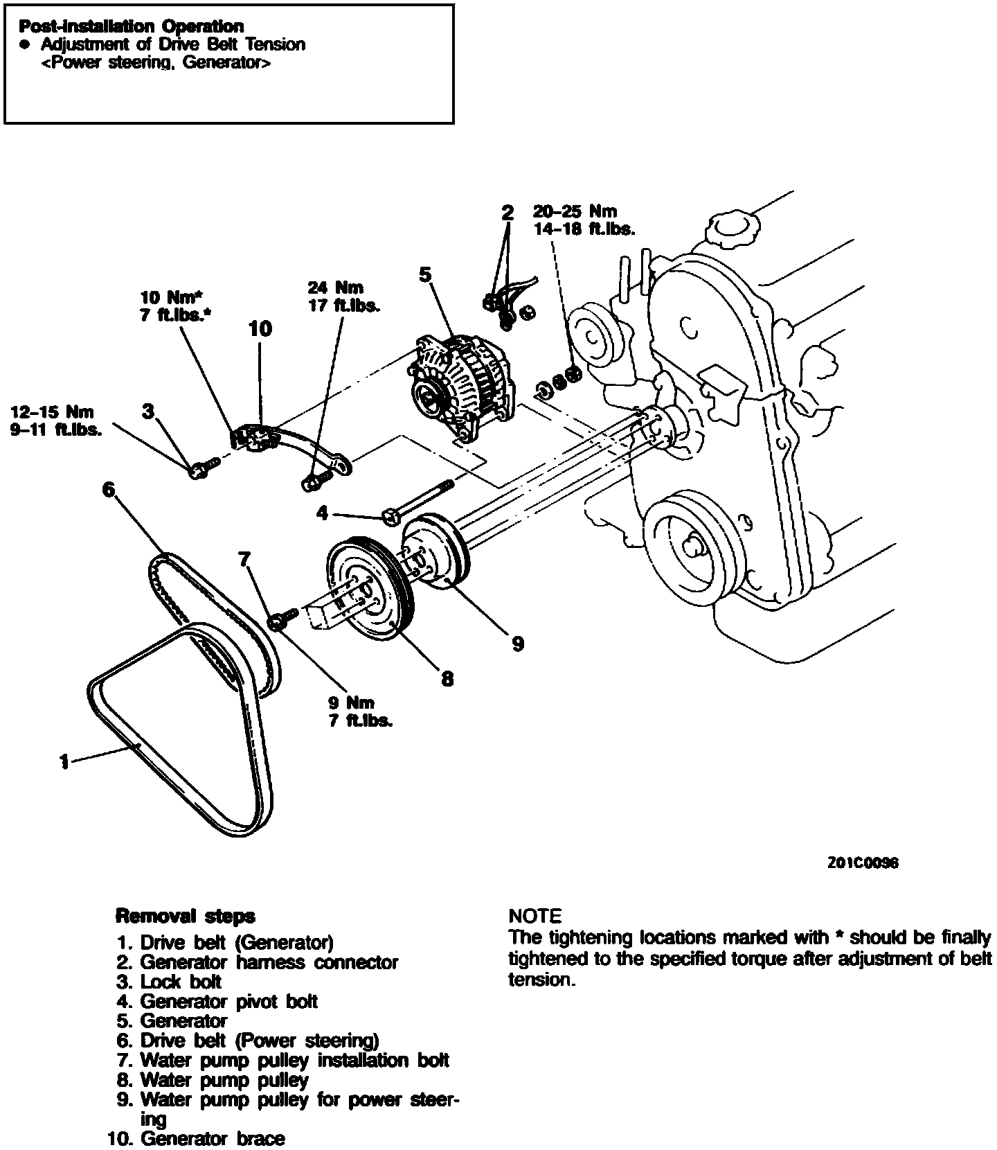 NOTE: The tightening locations marked with * should be finally tightened to the specified torque after adjustment of belt tension.