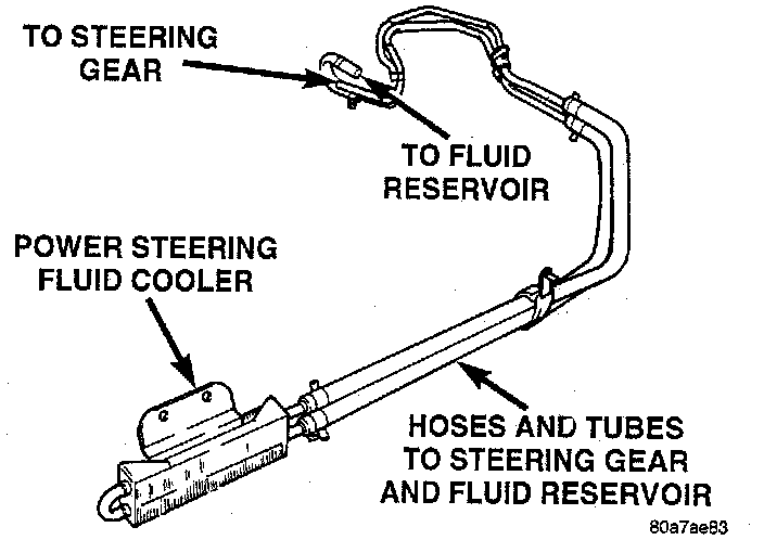 The cooler used on this vehicle is referred to as a fluid to air type cooler. This means that the air flow across the fins of the cooler is used to extract the heat from the cooler which it has absorbed from the power steering fluid flowing through it. The cooler is placed in series with the power steering fluid return line, between the steering gear and the power steering fluid reservoir. This lowers the temperature of the power steering fluid prior to it entering the power steering fluid reservoir where it is resupplied to the power steering pump.
