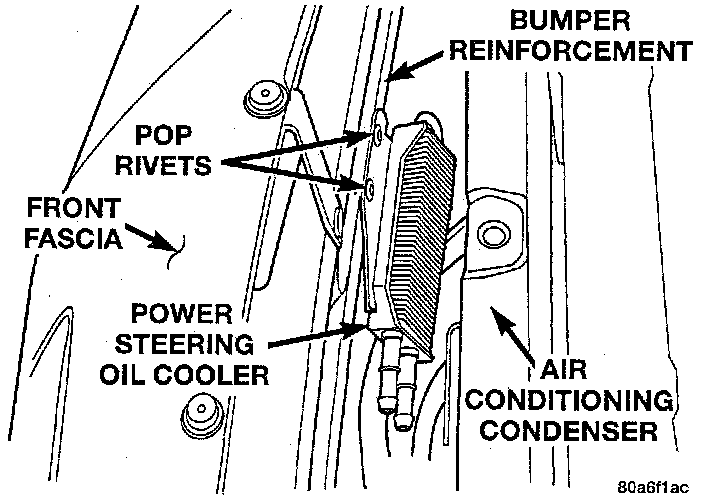The cooler for the power steering fluid is located in the front of the vehicle behind the front fascia. The cooler is positioned so it is in the direct air flow through the front fascia of the vehicle. The cooler is attached to the front bumper reinforcement using 2 pop rivets.