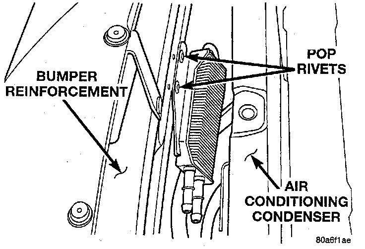 NOTE: The rivets holding the cooler to the bumper reinforcement must be removed by cutting the heads off the rivets, using the appropriate type of grinder and cutting tool.