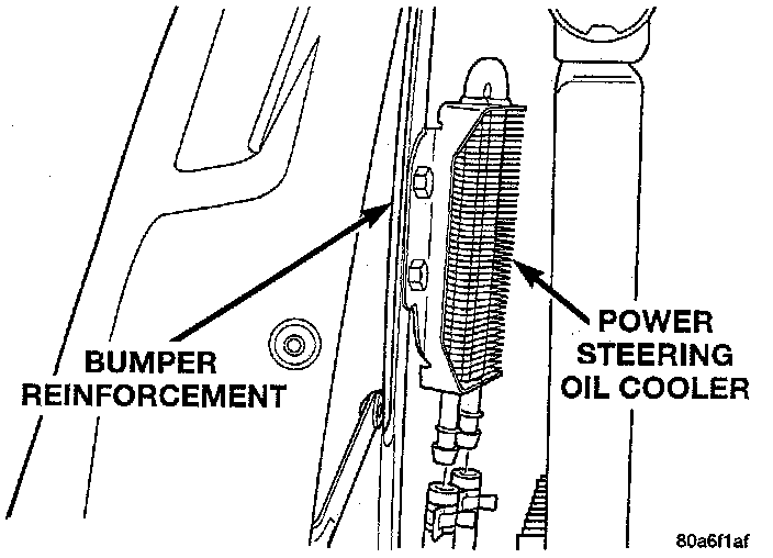 NOTE: When installing the power steering oil cooler on the bumper reinforcement, it is not attached using pop rivets as originally installed at the factory. Attach the power steering oil cooler to the reinforcement using 1/4-20 nut and a bolt of the correct length.