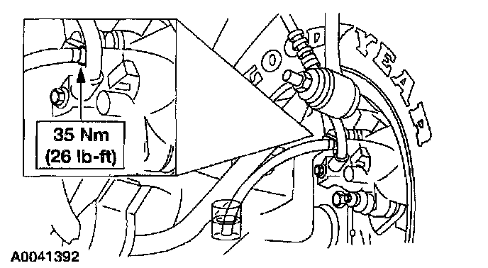 2. Loosen the rearmost brake tube fittings until a stream of brake fluid comes out. While the assistant maintains pressure on the brake pedal, tighten the brake tube fitting.