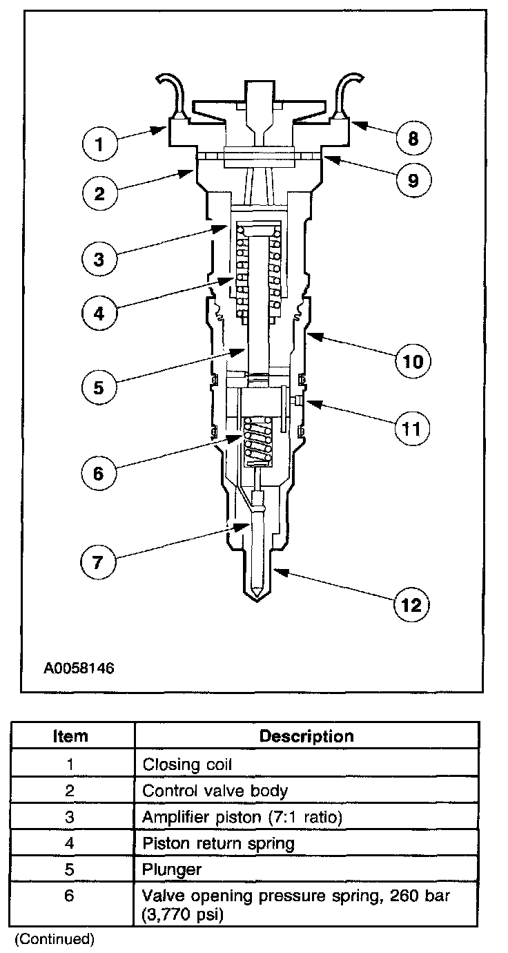 The high pressure oil flows from the oil rails into an Electro-Hydraulic Injector Amplifier Piston located in the injector. Oil entry and exit to and from the amplifier piston is controlled by a coil-operated spool valve.
