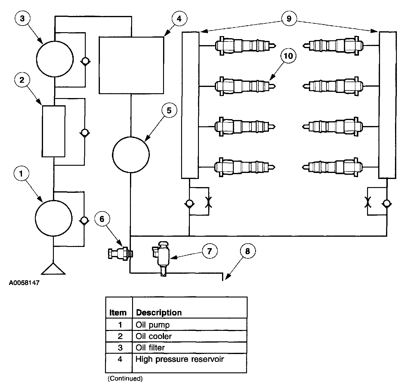 The 6.0L Powerstroke diesel injectors are powered by lubricating oil which is pressurized by a swashplate pump (Rexroth pump) in the engine valley. The pump output pressure ranges from 3,102 to 20,685 kPa (450 psi to 4,000 psi). Oil pressure is controlled by the Powertrain Control Module (PCM) through the Injector Pressure Regulator Valve. The PCM controls pressure in the oil rail by opening (relieving pressure) and closing (increasing pressure) the IPR valve. The high pressure oil is delivered to oil rails in the cylinder heads. An Injection Control Pressure sensor mounted on the high pressure pump cover sends an analog voltage signal (0.5V to 5.0V) to the PCM for feedback control of the oil pressure.