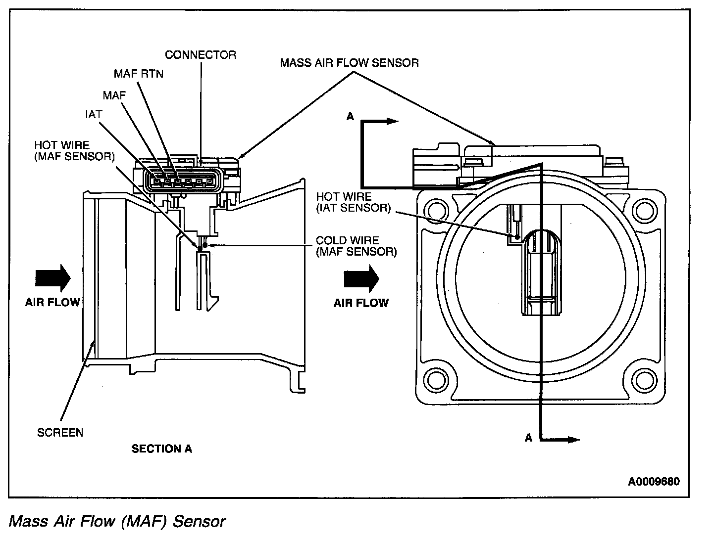 The 6.0L diesel utilizes two IAT sensors. The IAT sensor is integrated into the mass air flow (MAF) sensor. The powertrain control module (PCM) uses the IAT signal to control timing and fuel rate during cold starts and provide an input to the Cold Idle kicker.