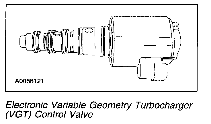The Electronic Variable Geometry Turbocharger (VGT) Control Valve is a four-way proportional hydraulic flow control valve with closed center position. The valve controls linear actuator position of a closed loop hydraulic servo by charging and venting flow on both sides of a piston. Linear displacement feedback from the actuator varies a feedback spring force to move the valve spool to the center closed position when the actuator reaches the desired position. Therefore, actuator position is dependent only on control valve current - it is independent of hydraulic fluid temperature and viscosity. The PCM characterizes the VGT/turbocharger at idle with the engine at normal operating temperature. It is possible to force a learn sequence by clearing the DTC's and allowing the engine to idle for 5 minutes at normal temperature. Audible noise is possible during the learn cycle.