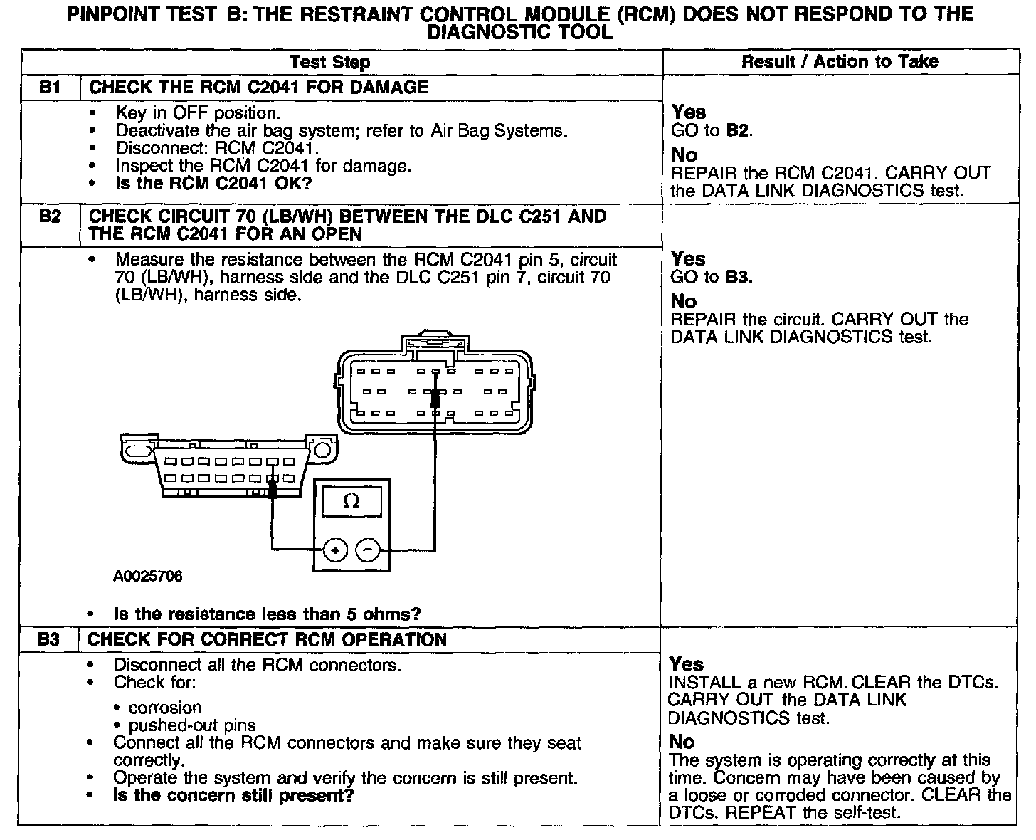 PINPOINT TEST B: THE RESTRAINT CONTROL MODULE (RCM) DOES NOT RESPOND TO THE DIAGNOSTIC TOOL