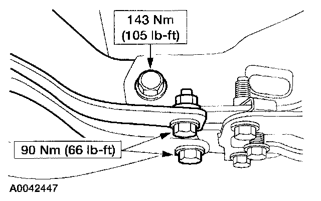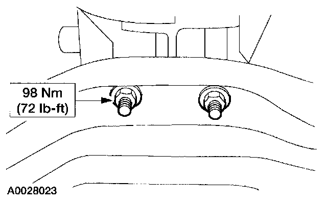 6. NOTE: Apply Threadlock 262 E2FZ-19554-B meeting Ford specification WSK-M2G351-A6 or equivalent to the transmission crossmember mounting bolts.