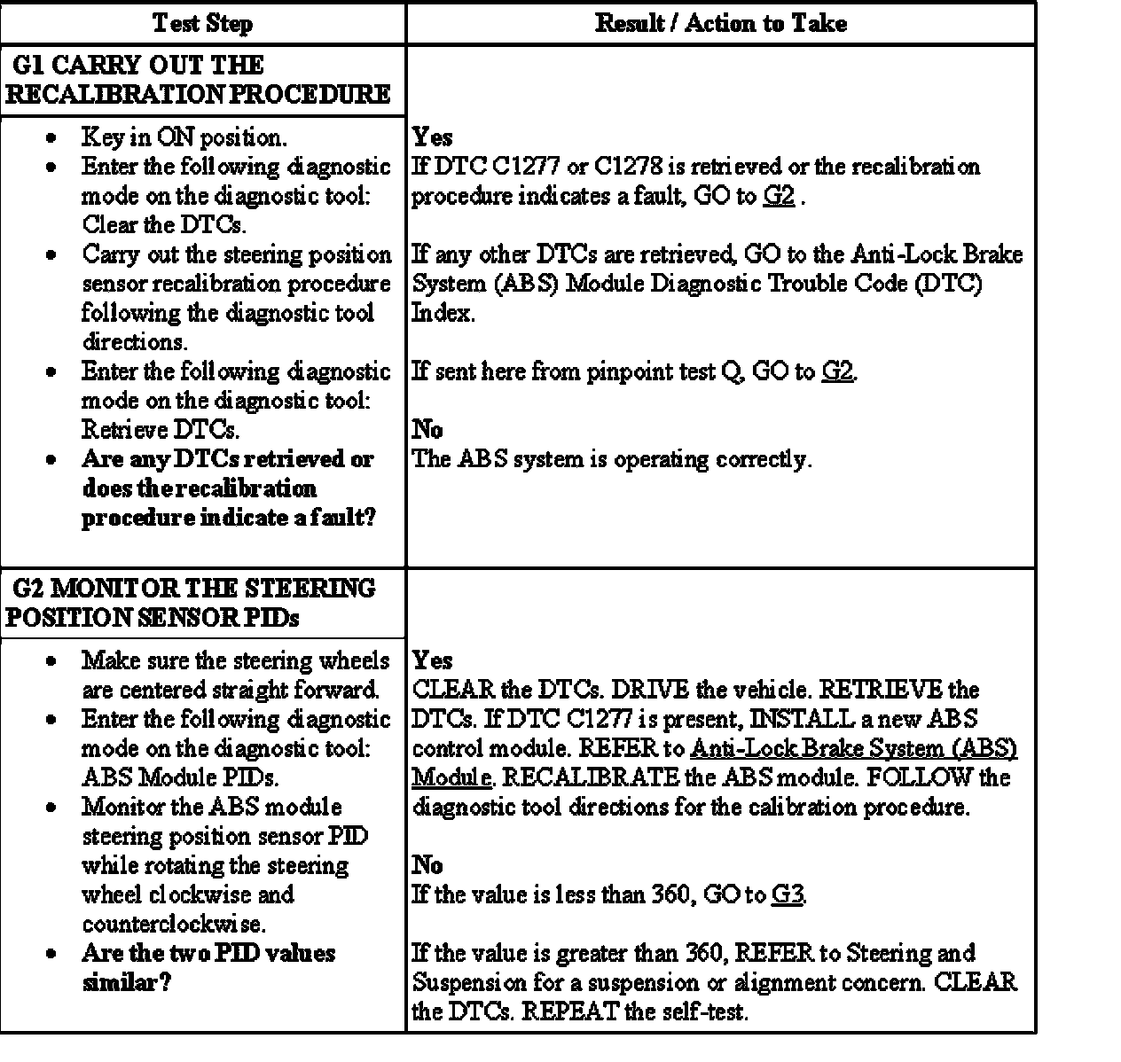 Pinpoint Test G: DTC C1277/C1278 Steering Wheel Angle 1 and 2 Circuit Failure/Faulted