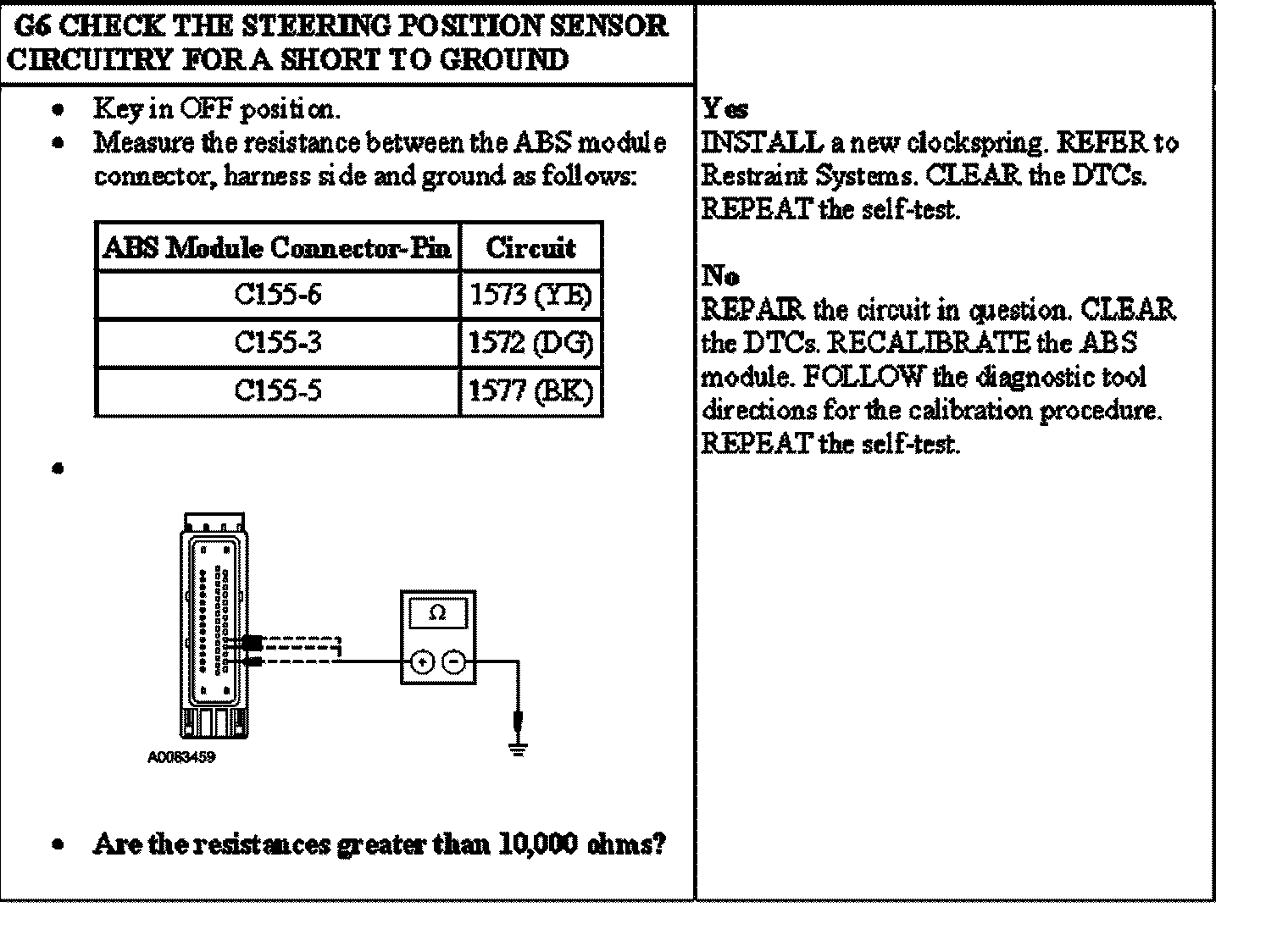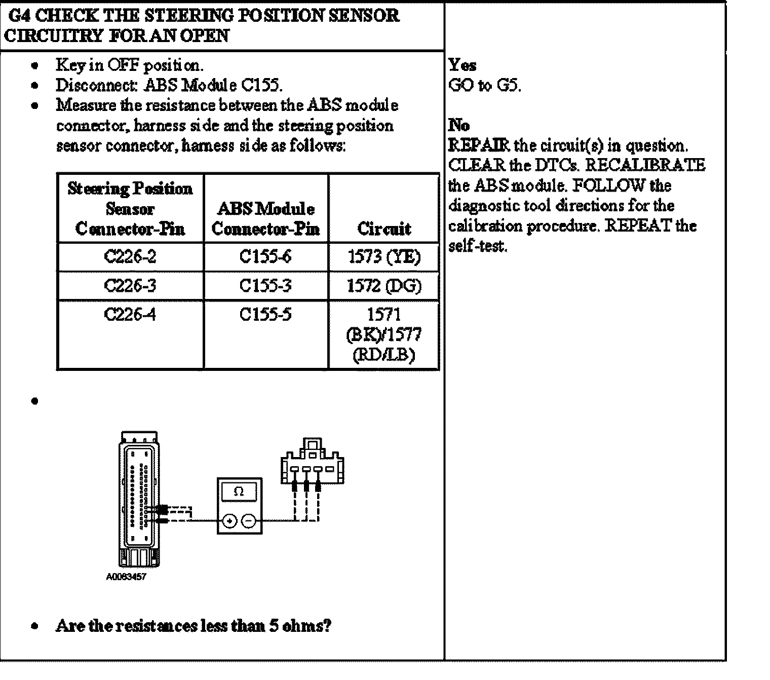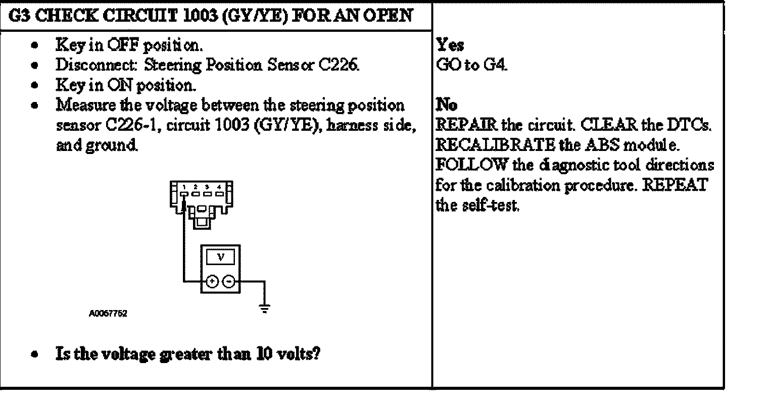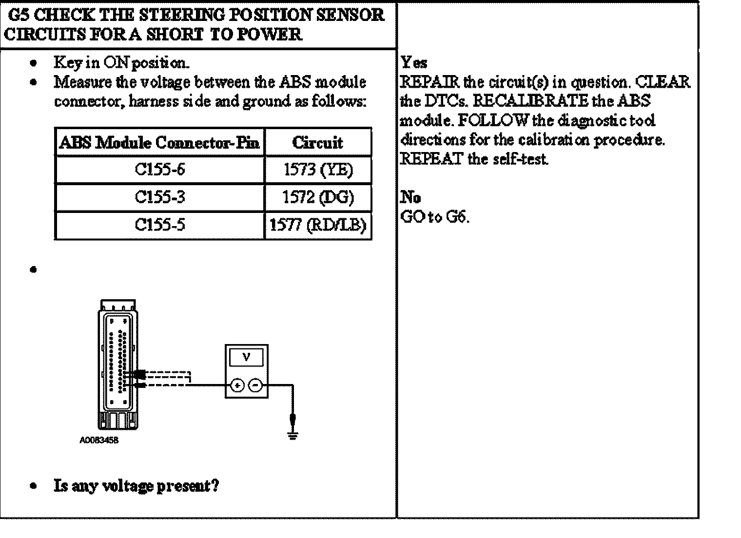 Steering wheel rotation (in degrees) is sent to the ABS module through circuit 1572 (DG) and circuit 1573 (YE). Voltage is supplied by the ABS module through circuit 1576 (TN/BK) which is spliced to circuit 1003 (GY/YE). Ground is provided by the ABS module through circuit 1577 (BK).
