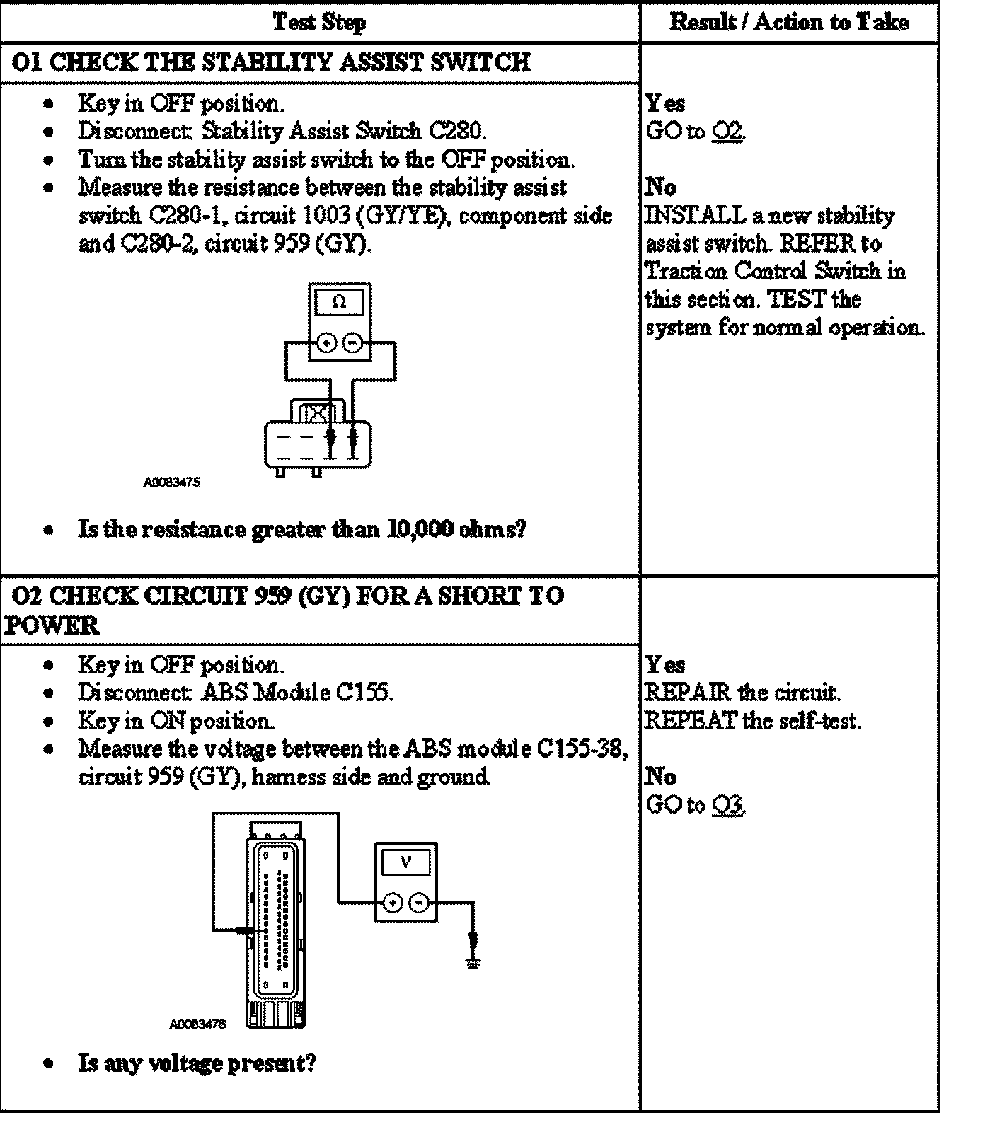 Voltage is supplied to the stability assist through circuit 1003 (GY/YE). The signal from the stability assist switch is sent to the ABS module through circuit 959 (GY).