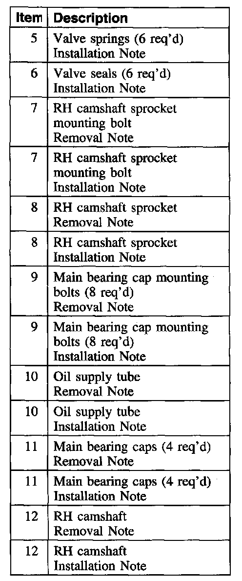 Items 12-7: Camshaft, Main Bearing Caps, Oil Supply Tube, Main Bearing Cap Mounting Bolts, and Camshaft Sprocket Installation Note