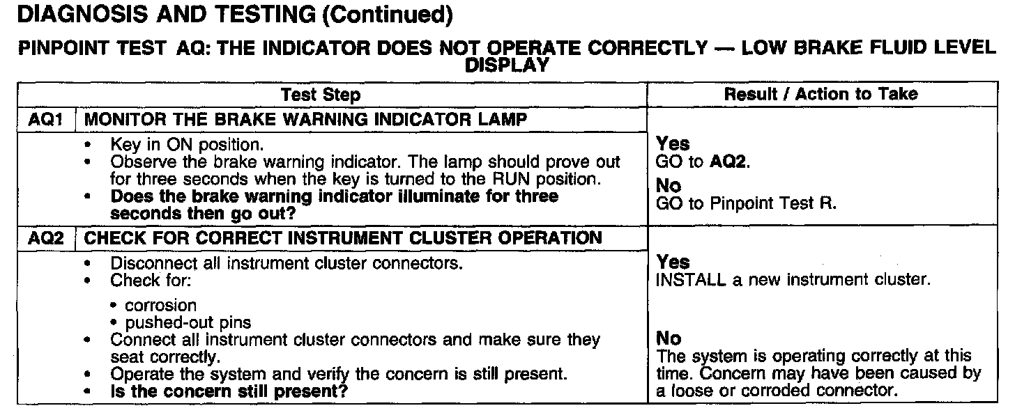 PINPOINT TEST AQ: THE INDICATOR DOES NOT OPERATE CORRECTLY - LOW BRAKE FLUID LEVEL DISPLAYTest AQ1-AQ2: