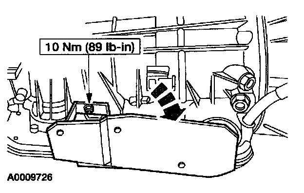 2. NOTE: If equipped, the transmission servo heat shield must be unclipped from the fluid pan rail and positioned aside for fluid pan removal.