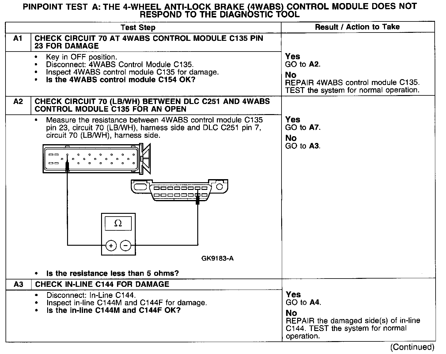 PINPOINT TEST A: THE 4-WHEEL ANTI-LOCK BRAKE (4WABS) CONTROL MODULE DOES NOT RESPOND TO THE DIAGNOSTIC TOOL