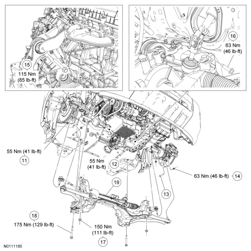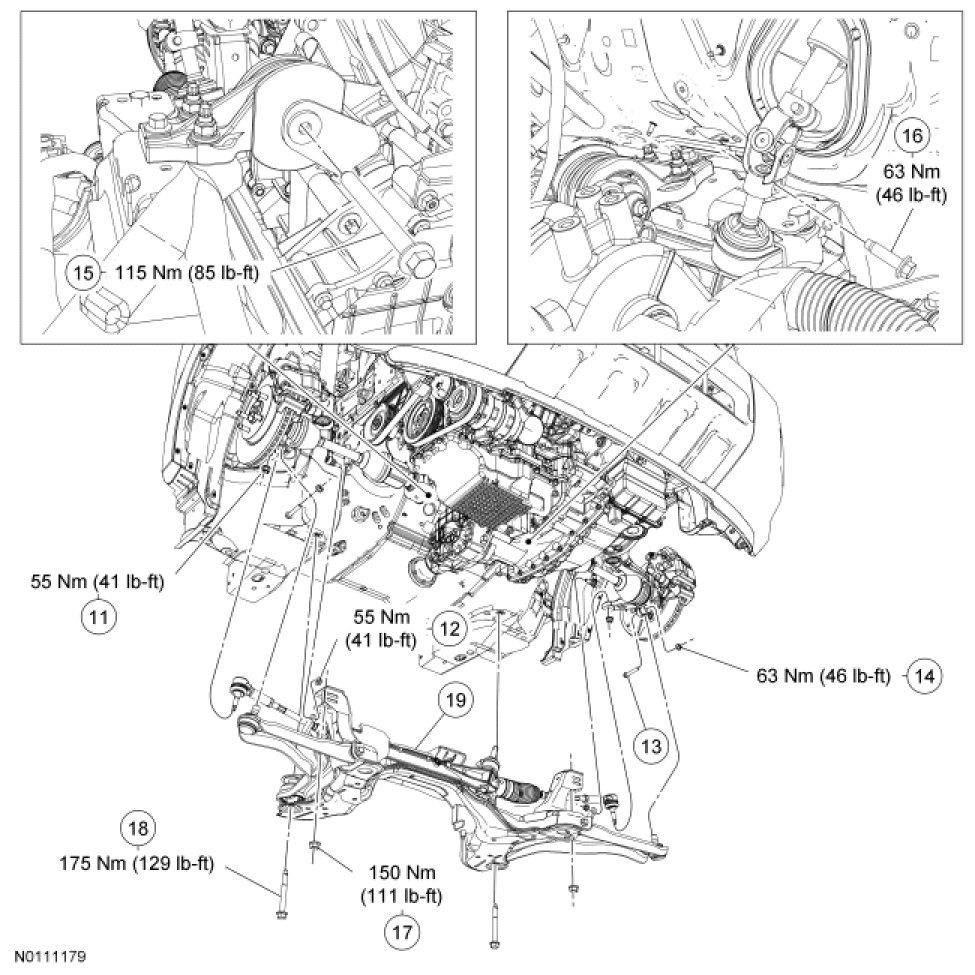 NOTE: When installing the front subframe rear bolts, make sure both of the front subframe rear bolts are fully engaged in their cage nuts before tightening to specification.