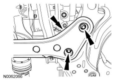 21. NOTE: Do not allow the front subframe rear bolts to come out of the lower control arm bushing.