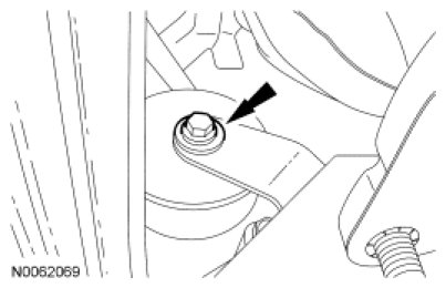 13. Remove the nut and the engine support crossmember. Discard the nut.